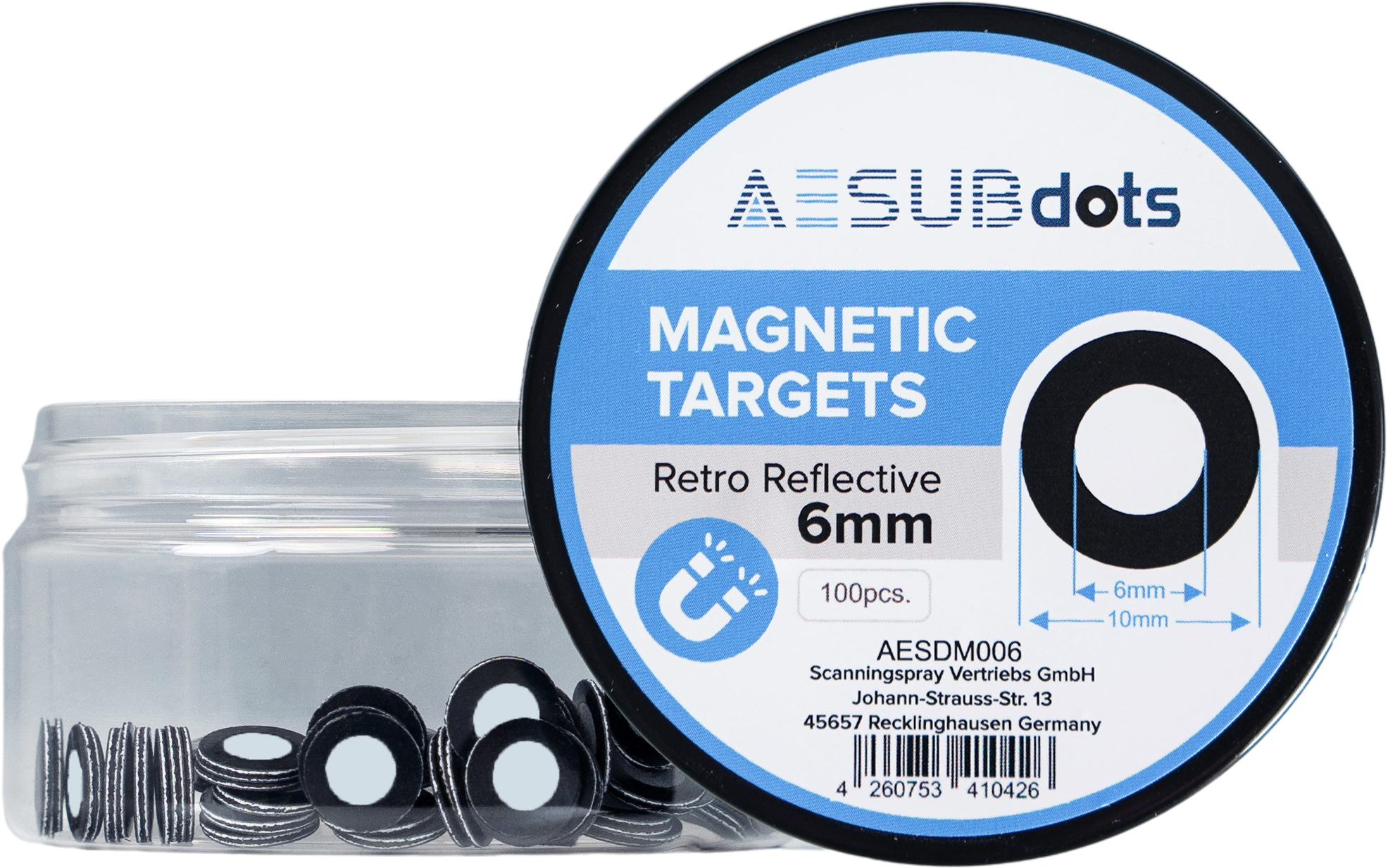 AESUBdots retro reflective magnetic to odblaskowe, magnetyczne punkty referencyjne do precyzyjnego i wydajnego przechwytywania danych 3D. Dzięki magnetycznemu podłożu kropki można łatwo przymocować do metalowych powierzchni i zmienić ich położenie w dowolnym momencie. Oznacza to szybsze przygotowanie, mniejszy wysiłek i powtarzalne wyniki - idealne dla wymagających procesów skanowania!