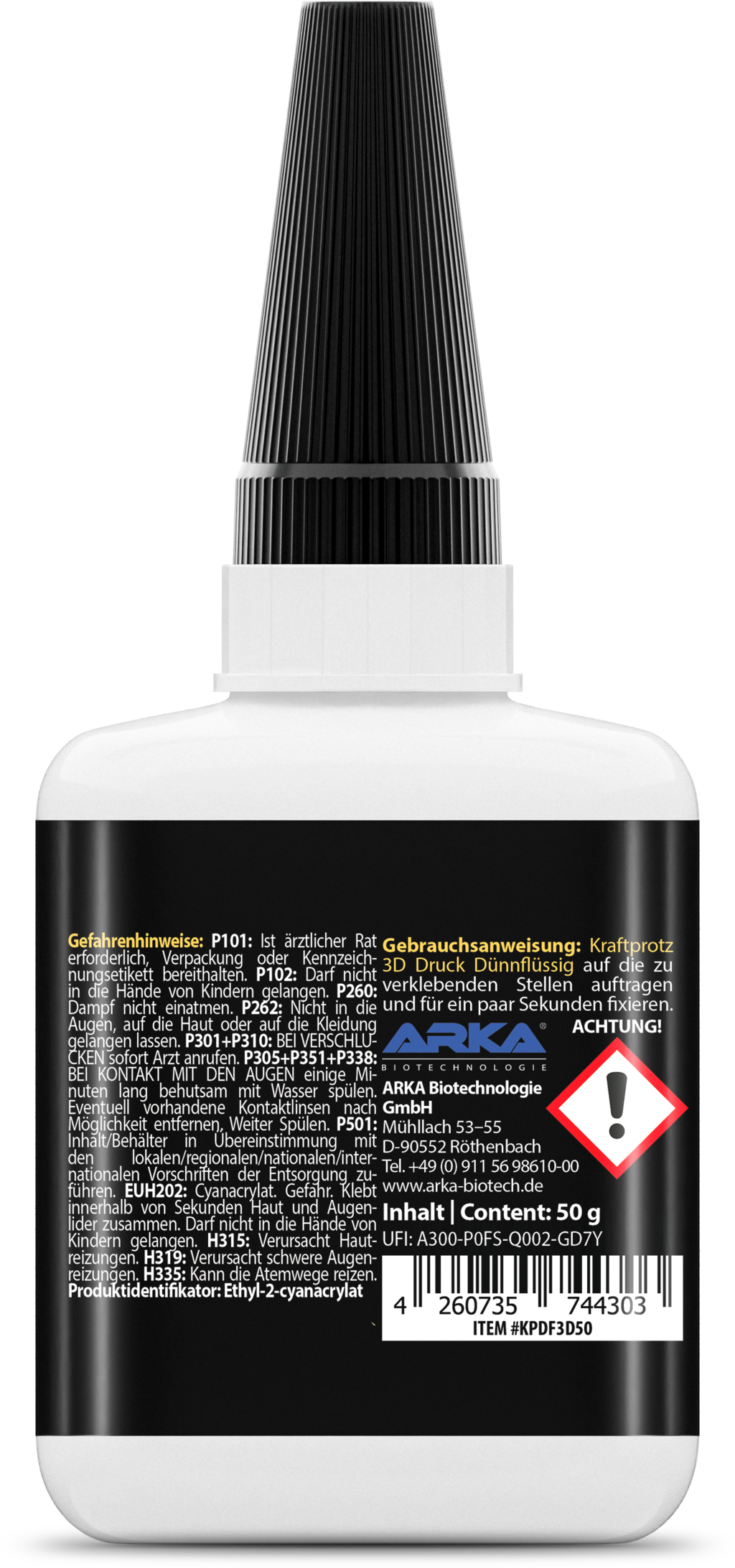 Połącz wydrukowane części 3D bezpiecznie i trwale za pomocą jednoskładnikowego kleju błyskawicznego ARKA Kraftprotz. Opracowany specjalnie dla PLA, ABS, PETG i TPU, nie tylko zapewnia niezwykle mocne połączenie, ale także niezwykle szybko wysycha. Ten klej jest odporny na ciepło, warunki atmosferyczne i wodę, co czyni go idealnym dodatkiem do drukarki 3D!
