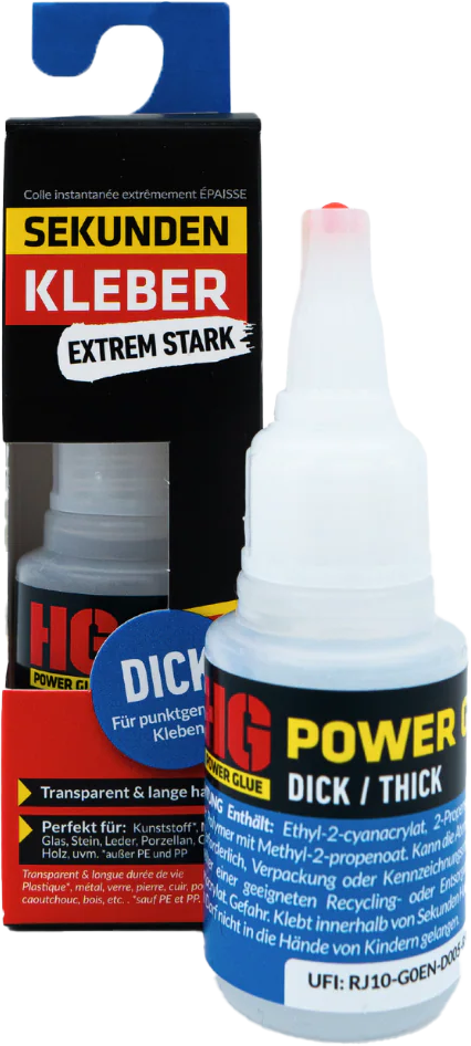 | Uwaga! Klej błyskawiczny nie nadaje się do murów, tkanin, tektury, jeansu. W przypadku tworzyw sztucznych, takich jak PE, PP lub silikon, dodatkowo wymagany jest HG Power Glue Primer jako środek zwiększający przyczepność. |
