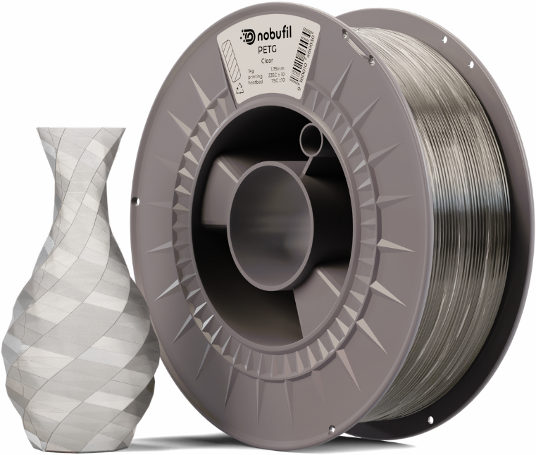 PETG firmy Nobufil to filament pochodzący z recyklingu, wykonany z odpadów tworzyw sztucznych, które charakteryzuje się doskonałą przyczepnością warstw, trwałością i wytrzymałością. Materiał ma wysoką odporność na uderzenia i ma podobną odporność na temperaturę i wytrzymałość jak ABS.