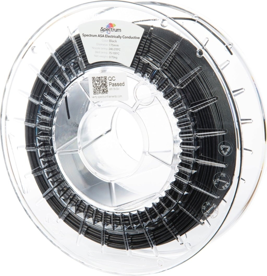 Spectrum ASA Electrically Conductive to specjalistyczny filament przewodzący prąd elektryczny, oparty na wytrzymałym polimerze ASA wzbogaconym nanorurkami węglowymi (CNT). Zapewniają one bardzo niską rezystancję powierzchniową, wynoszącą około 40 Ω, co czyni go idealnym materiałem do zastosowań wymagających kontrolowanego przewodnictwa elektrycznego.