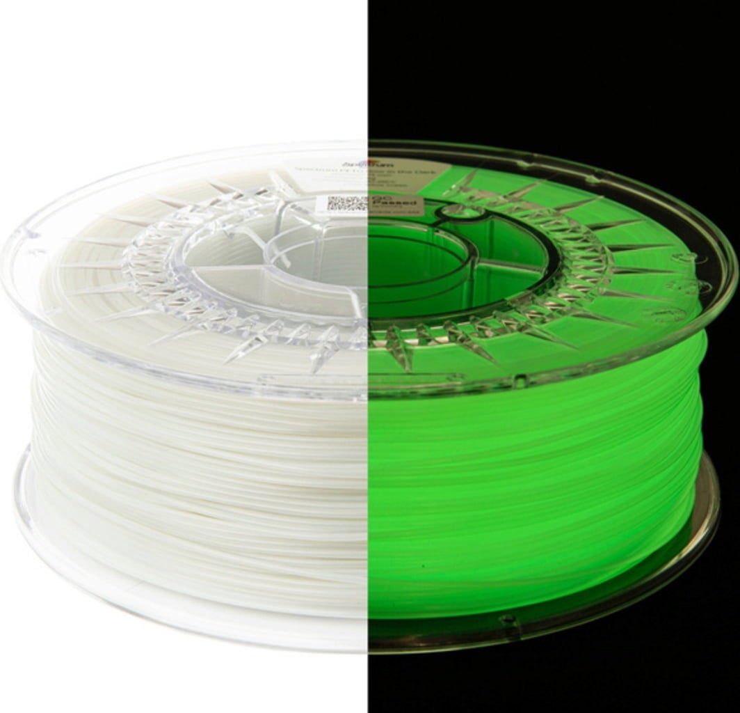 PLA Glow in the Dark - to materiał ze związkiem fosforu, który umożliwia świecenie wydrukowanego modelu 3D w ciemności po naświetleniu. Ponieważ jest to materiał na bazie PLA, łatwo go drukować.