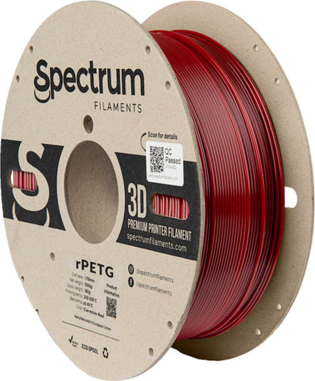 Spectrum RPETG to materiał do druku 3D pochodzący z recyklingu PETG lub odpadów z wytłaczania. Surowiec jest zbierany, rozdrabniany, ponownie mieszany i łączony w celu uzyskania wysokiej jakości filamentu PLA o mniejszym wpływie na środowisko. Materiał zachowuje właściwości klasycznego PETG, takie jak łatwość drukowania i niski skurcz, łącząc je ze stosunkowo wysoką wytrzymałością na rozciąganie.