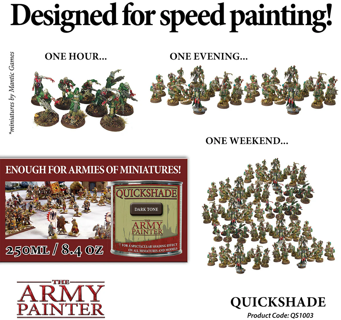 Dzięki Quickshade Dip od The Army Painter możesz w mgnieniu oka wysłać swoje figurki do krainy cieni i przywrócić im więcej szczegółów i dynamiki! Ta rewolucyjna farba zanurzeniowa tworzy realistyczne cieniowanie, które nadaje modelom głębię i charakter - bez konieczności wielogodzinnego nakładania warstw. Wystarczy zanurzyć, odsączyć i profesjonalne wykończenie jest gotowe!